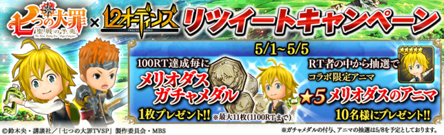 コラボを記念して12オーディンズ公式TwitteにてRTキャンペーンを開催!キャンペーン期間中に、『12オーディンズ』公式Twitterアカウント(@12_odins)をフォローし、キャンペーンハッシュタグの入ったツイートをリツイートすることでキャンペーンに参加することができます。リツイート数に応じてゲーム内で使用できるコラボガチャ専用ガチャメダルを全員にプレゼント!詳細は、12オーディンズ公式サイト内のお知らせページをご覧ください。