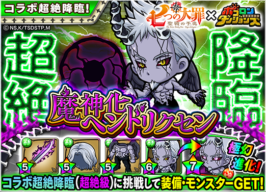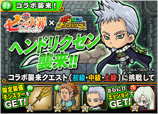 2017年7月21日(金)より、「ポコロンダンジョンズ」内に「七つの大罪」のキャラクター「ヘンドリクセン」、「ドレファス」、「魔神化ヘンドリクセン」がボスとして登場するコラボレーションイベントを実施するほか、新たに登場するキャラクターや極幻進化が解放されるキャラクターも含めた合計8体が登場するコラボレーションガチャ、キャンペーン期間中にログインした方全員に「女神の瞳 エリザベス(★4)」をプレゼントするログインキャンペーンなどを実施いたします!