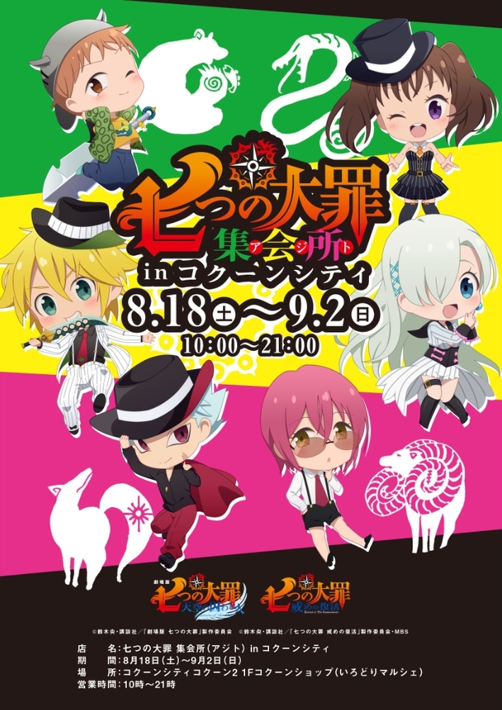 「劇場版 七つの大罪 天空の囚われ人」の公開を記念して、さいたま新都心「コクーンシティ」に「七つの大罪」の期間限定ショップがやってきます!8月18日(土)の映画公開と同日オープンです。施設内には映画館もあるので、映画を観た後はぜひお店に遊びにきてください。
