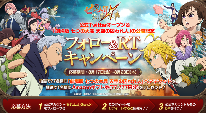 また、ゲーム公式Twitterのオープン&「劇場版 七つの大罪 天空の囚われ人」の公開を記念して、ゲーム公式Twitterフォロー&指定のツイートをRTして頂いた皆様の中から抽選で77名様にペアチケットを、また抽選で1名様にAmazonギフト券(77,777円分)をプレゼントするキャンペーンを実施中です。