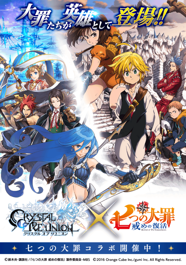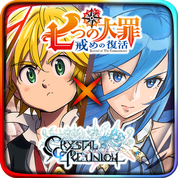 TVアニメ『七つの大罪 戒めの復活』のキャラクター「メリオダス(CV:梶裕貴)」、「エリザベス(CV:雨宮天)」、「ディアンヌ(CV:悠木碧)」、「バン(CV:鈴木達央)」、「キング(CV:福山潤)」が『「クリスタル オブ リユニオン』の世界に英雄として登場します!さらに「赤き魔神」が魔獣となって出現いたします。『クリユニ』の世界で活躍する彼らにご期待ください!